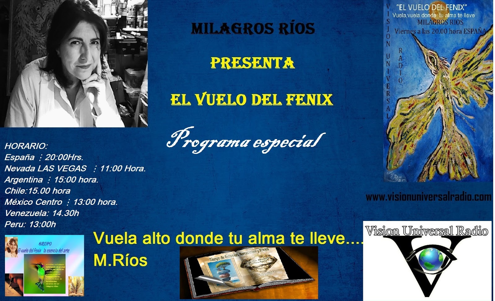 Un programa hecho para difundir el arte del sentir de las letra ,El vuelo del Fénix lleva emitiéndose casi cuatro años difundiendo el arte de las palabras y el sentir de ella, gracias a todos los que colaboráis en la realización de este ,a todos lo que pasasteis por el ,a todos que dejáis vuestra esencia en el ,un programa hecho desde el alma. Un programas de poesía de reflexiones y pensamientos y el arte de la música una unión hermosa para el mundo